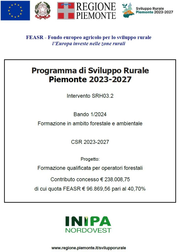Tipologia corso: Corso interamente finanziato con il contributo congiunto di Comunità Europea, Stato Italiano e Regione Piemonte nell’ambito del Complemento per lo Sviluppo Rurale ai sensi del CSR 2023-2027 – Intervento SRH03.2 - Bando 1/2024 Formazione professionale in campo forestale e ambientaleStato: Autorizzato